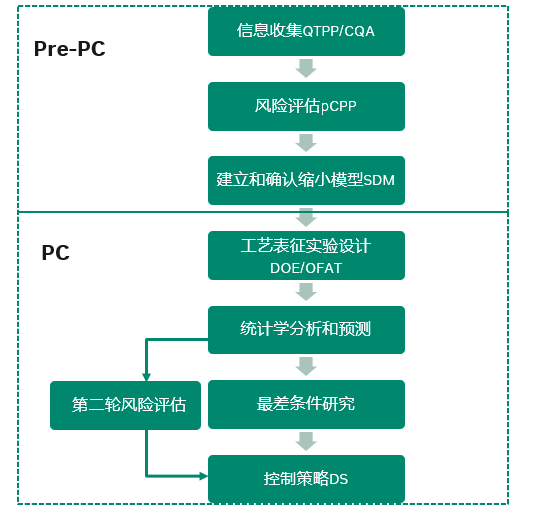 工艺表征的目的是系统性地研究工艺参数和原材料属性对工艺表现的影响,通过第一阶段工艺表征前Pre-PC的信息收集、风险评估、缩小模型建立,第二阶段工艺表征PC阶段的实验设计、统计学预测、最差条件研究、结合第二轮风险评估筛选出关键工艺参数CPPs、关键物料属性CMAs和KPPs并确定其可接受范围PAR和可操作空间NOR,最终建立工艺控制策略,为后续工艺验证PV、采用PAT过程监控控制策略CS、产品整个生命周期管理打下基础。