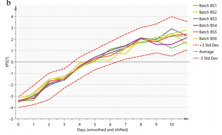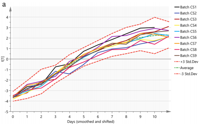 对建立的缩小模型,需要与生产批数据进行过程代谢,产品质量等方面进行可比性研究,确认缩小模型可代替商业化生产规模。上游案例是通过9批商业化生产规模数据(图6虚线),经SIMCA软件(PLS分析模型)处理,建立±3SD或者95%置信区间,细胞培养过程代谢参数,产品质量数据和过程数据均处于该区间内,则证明缩小模型可比(图7)。即该缩小模型可代替商业化规模,用于PC研究。