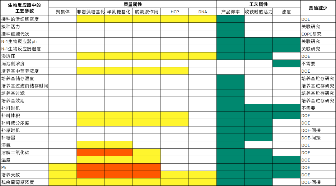 关键工艺参数 (Critical Process Parameter, CPP) 根据ICH Q8指对关键质量属性 (CQA) 有影响的工艺变量,应予以监控或控制以确保药品获得所需的质量。根据评估得到的CQA,进一步采用风险评估的方法(如FMEA、因果矩阵、流程图、鱼骨图)从大量的工艺参数中剔除出非关键的工艺参数,筛选出潜在的CPP (pCPP) ,如图5A-mab中生产生物反应器中工艺参数的第一轮风险评估结果。通过后续实验中研究,进而获得稳健的控制策略。
