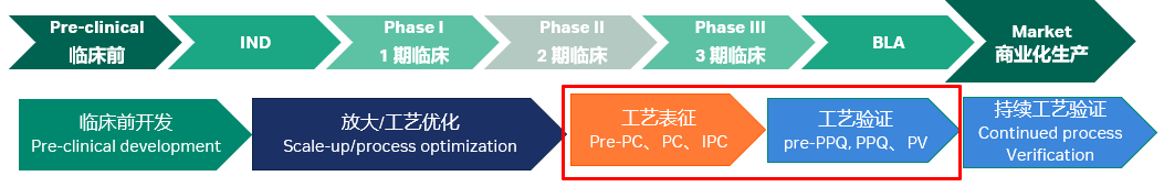 工艺表征 (Process Characterization, PC) 的目标是确保有效和成功的工艺验证和保证一致的工艺性能。工艺表征工作一般在临床Ⅱ期结束后,工艺性能确认 (Process Performance Qualification, PPQ) 开始前进行。