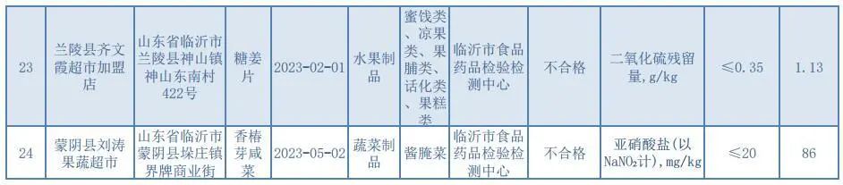 兰陵县齐文霞超市加盟店销售的糖姜片(2023-02-01),二氧化硫残留量项目不合格