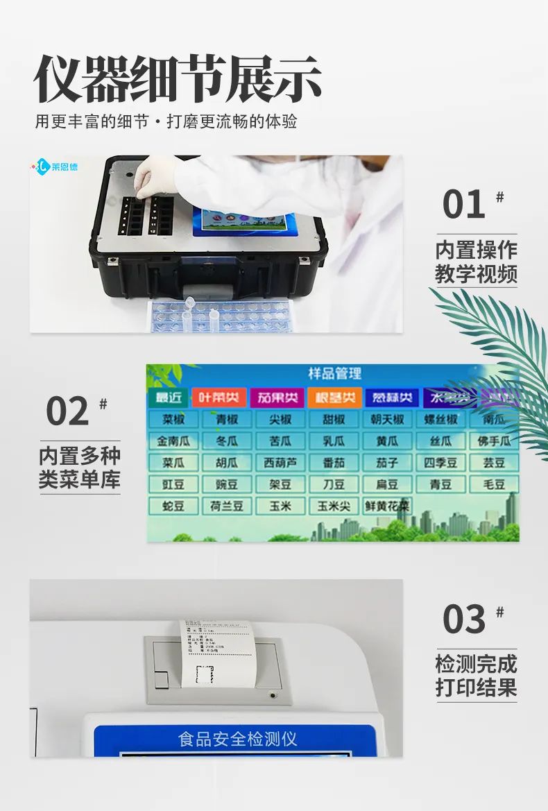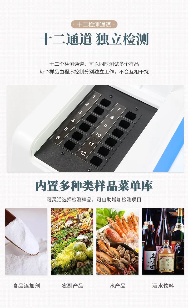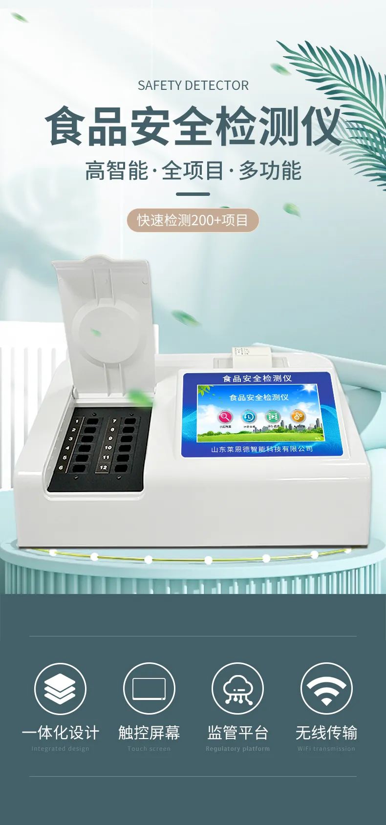 该仪器还可用于水果、蔬菜、茶叶和谷物的检测。目前,在许多食品安全检测机构等领域都有仪器。此外,食品检测仪还可用于果蔬、茶叶生产基地和农民批发销售市场的现场检测,以及餐厅、食堂和家庭果蔬加工前的安全快速检测。
