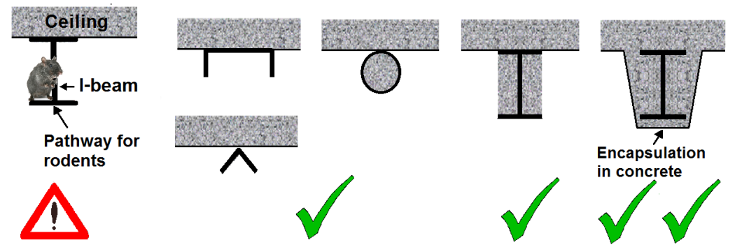 为防止鼠类在内部横梁上活动,应避免使用裸露的工字钢材料。