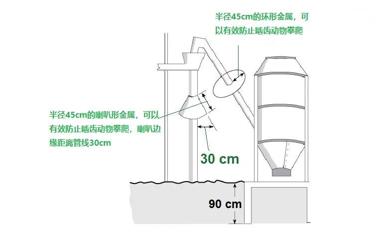 如下图,在室外管线外安装环形或喇叭形的金属装置,可以有效阻挡鼠类前进的路径。