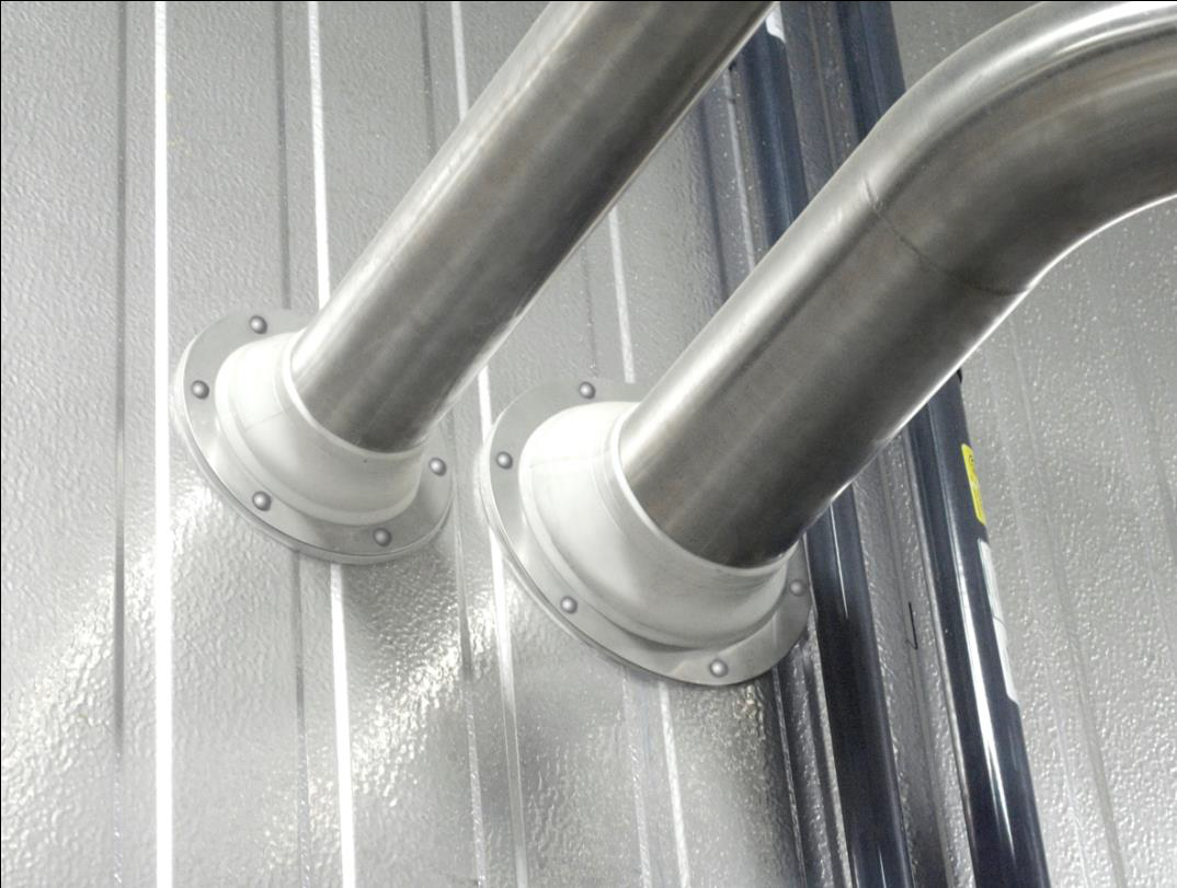 管道穿墙位置周围的不锈钢护板可以确保墙壁(或天花板)的防水性和气密性。假设其中一个房间相对于相邻房间处于正压状态,如果穿过墙壁或天花板的孔洞没有正确密闭而漏气,则会造成过多的风量损失,降低正压效果。
