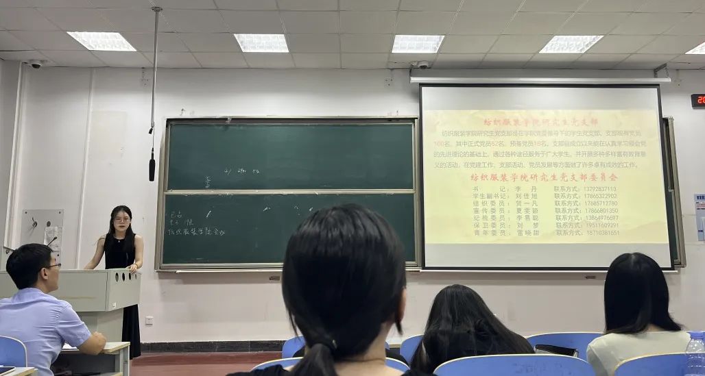 纺织服装学院研究生党支部委员会组织委员贺一凡同志向新生做入党环节知识讲解,研究生支部委员会成员分别做了自我介绍,演讲主要介绍了研究生党支部的主要情况,详细讲解了党员发展流程,并对相关材料的书写做了说明。