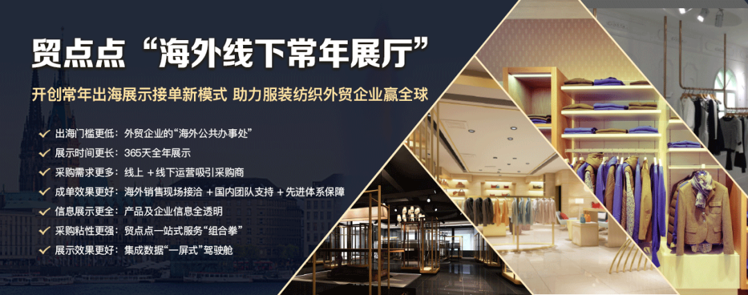 今年以来,贸点点率先在德国汉堡设立“海外线下常年展厅”,并通过一条龙的常年出海展示及接单服务,帮助广大服装纺织外贸企业更进一步降低获客成本、提高接单成功率及利润率。