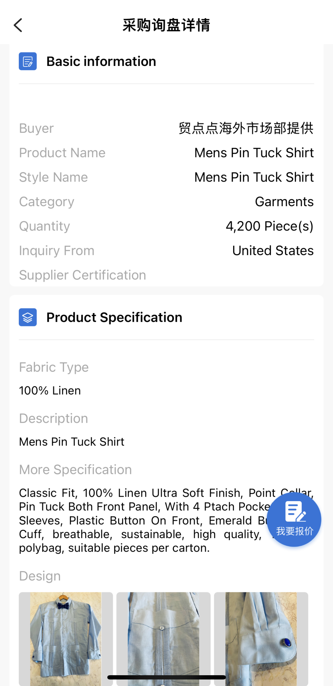 采购要求:1)男装厂商,熟悉亚麻面料服装的生产;2)产品质量要求高,注重做工和细节;3)稳定的供货能力和准时的交付。
