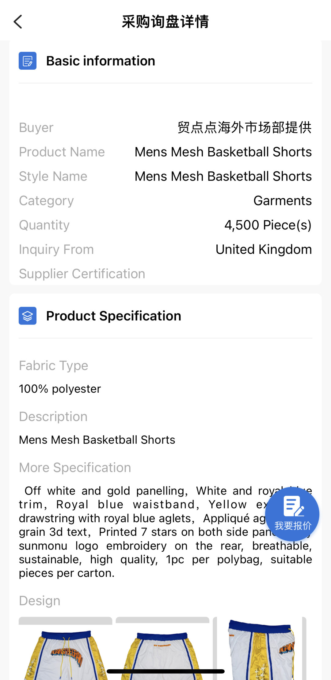 对接中的订单:男士篮球运动短裤4,500件