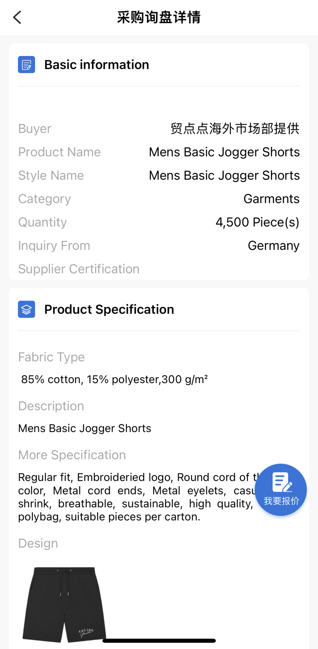对接中的订单:男士慢跑短裤4,500件