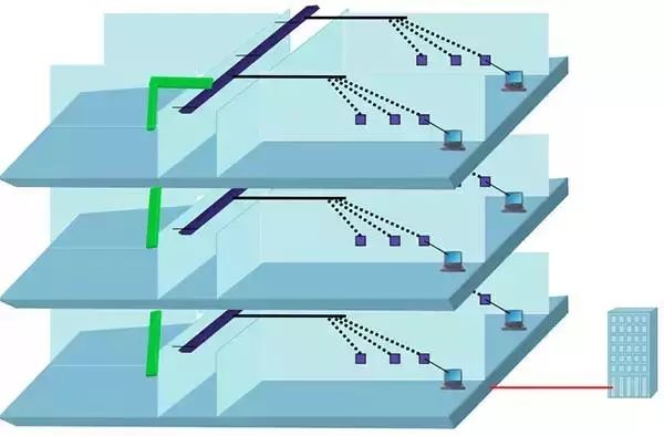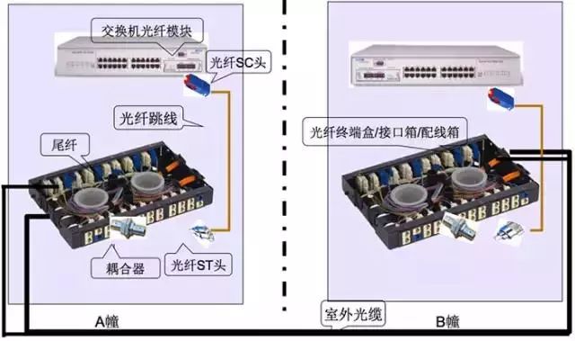 交换机光纤模块A ─光纤跳线 ─ 耦合器 ─尾纤 ─室外光缆─尾纤─耦合器 ─光纤跳线─交换机光纤模块B