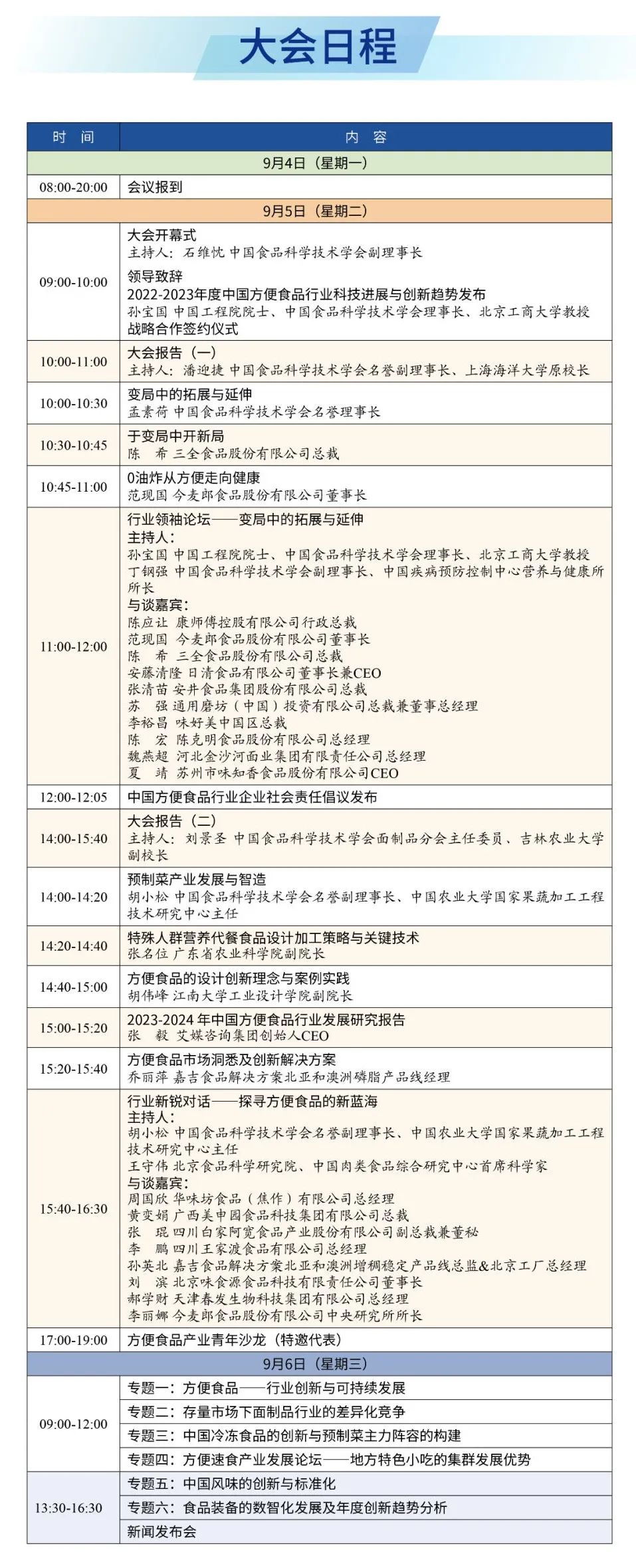 会议聚焦方便食品产业的最新发展趋势,探讨产业格局发生变化过程中,企业面临的挑战和商机,邀请政府相关主管部门领导、院士、权威专家、头部企业代表等嘉宾与会分享,从科技创新与产业发展的角度,用敏锐的洞察力深入剖析行业,预判新格局下方便食品行业发展的新未来。为各位企业代表提供一个广阔的交流平台,共同探讨如何应对行业变革,实现持续创新发展。