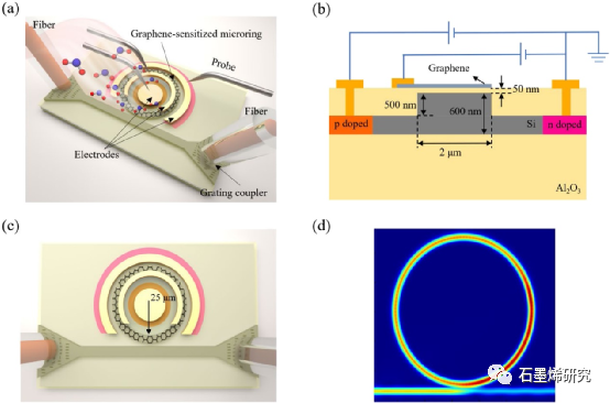 图1. 提出的石墨烯敏化MRR气体传感器示意图。(a)气体传感器三维示意图。(b)石墨烯覆盖的SOS MRR的波导截面。电极可以用来改变硅波导中自由载流子的浓度,也可以用来调节外电场下石墨烯的费米能级。(c)石墨烯敏化MRR气体传感器俯视图。(d)共振波长处MRR的电场分布。
