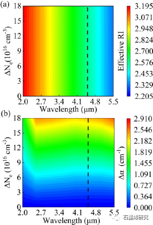 图2. SOS波导中红外透明窗口内的有效RI (a)和光吸收系数(b)随波长和注入自由载流子浓度的变化。