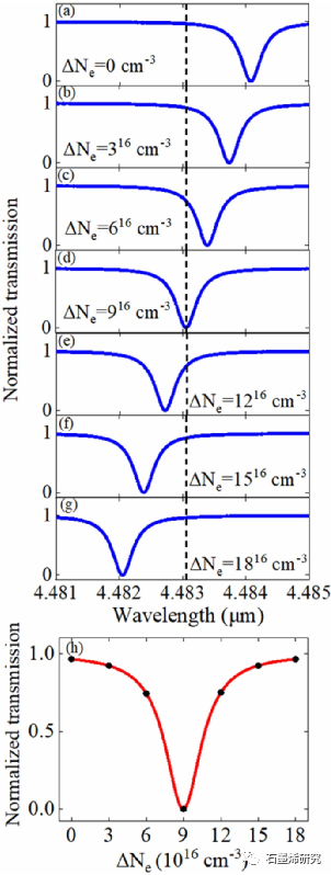 图4. 不同自由载流子浓度(a)-(g),石墨烯覆盖的MRR在波长域的归一化透射率,以及在4.48306 μm (h)波长处的MRR透射率采样。