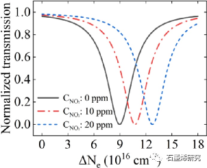 图5. 不同气体浓度下,石墨烯覆盖MRR的归一化透射率随注入自由载流子浓度的变化。