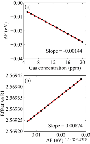 图3. 计算了石墨烯费米能级的变化和石墨烯覆盖SOS波导的RI。(a)石墨烯费米能级随NO2气体浓度的变化。(b)石墨烯覆盖SOS波导的有效RI与石墨烯费米能级变化的关系。