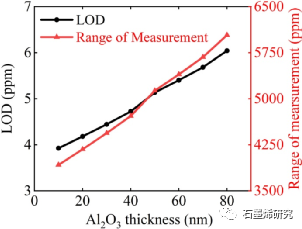 图6. LOD和测量范围与Al2O3厚度的关系。