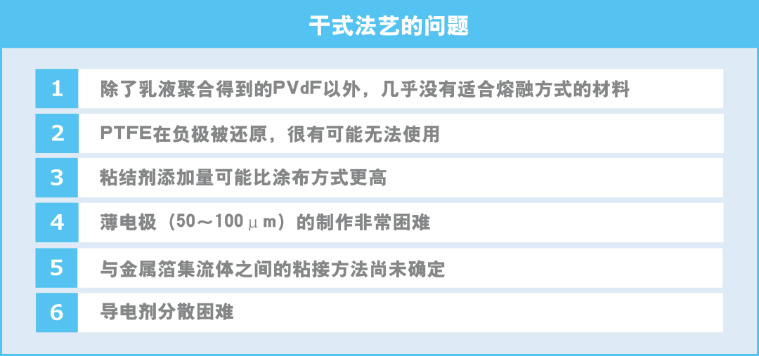 不使用溶剂的干法工艺有很多优点,是今后备受期待的电极制造方法,但该方法仍存在一些有待突破的障碍。下表举例说明了一些必须解决的问题。