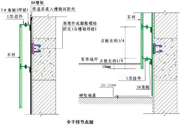 f、石材厚度在5~8cm直接采用背栓连接,石材厚度大于8cm时,采用化学植筋连接,背栓或化学植筋伸入石材长度不可小于石材厚度的一半胶;
