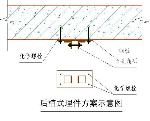 后植式埋件方案,要求钢板和角码先在工厂焊接加工,整体热镀锌完成后,进行现场安装。