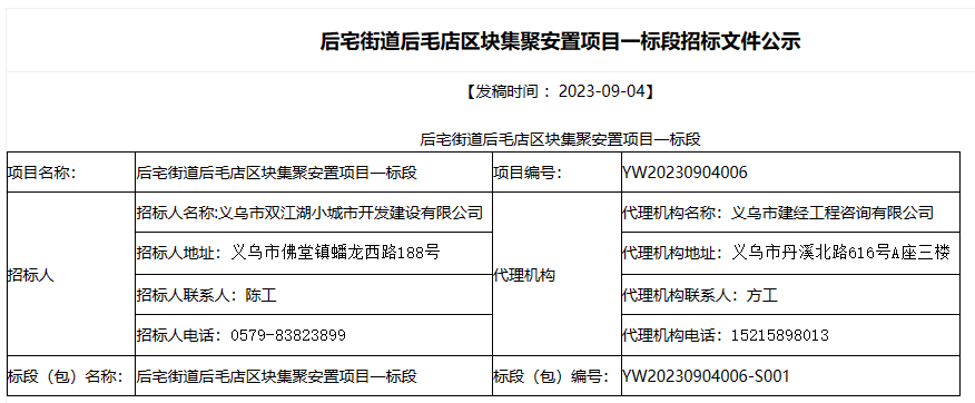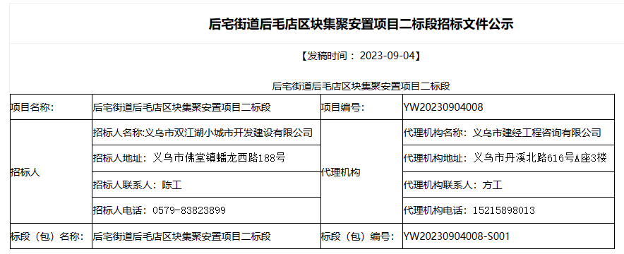9月4日,义乌市后宅街道后毛店区块集聚安置项目一、二标段招标文件公示。招标文件显示,后宅街道后毛店区块集聚安置项目一、二标段已义乌市发展和改革局以后宅街道后毛店区块集聚安置项目批准建设,建设资金来自自筹,出资比例为100%。项目业主为义乌市双江湖小城市开发建设有限公司,委托代理机构为义乌市建经工程咨询有限公司。总建筑面积约为154314.22㎡,地下建筑面积约为42566.58㎡,地上建筑面积约为111747.64㎡,由地下车库、16栋高层及1栋配套用房组成,其中地下1层,高层地上17层、配套用房1层。本次工程量清单编制造价49624万元,施工总工期790日历天。总建筑面积约为249945.14㎡,地下建筑面积约为103196.48㎡,地上建筑面积约为146748.66㎡,由地下车库、20栋高层及1栋配套用房组成,其中地下2层(局部1层),高层地上17/15层、配套用房1层。本次工程量清单编制造价72846万元,施工总工期790日历天。本次招标范围包括施工图范围内的土石方及基坑支护工程(未施工部分)、土建工程、安装工程(包括给排水、电气、暖通、消防等)、建筑智能化工程、电梯工程等施工以及项目的总承包服务等工作内容纳入本标段招标范围, 具体详见工程量清单及工程施工图纸。