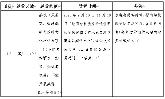 中标团队自签订入驻协议之日起开始经营,经营期限不超过1个学期,到期前创新创业学院实践管理部重新组织招标。