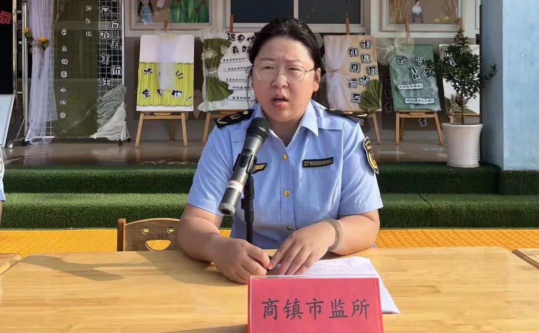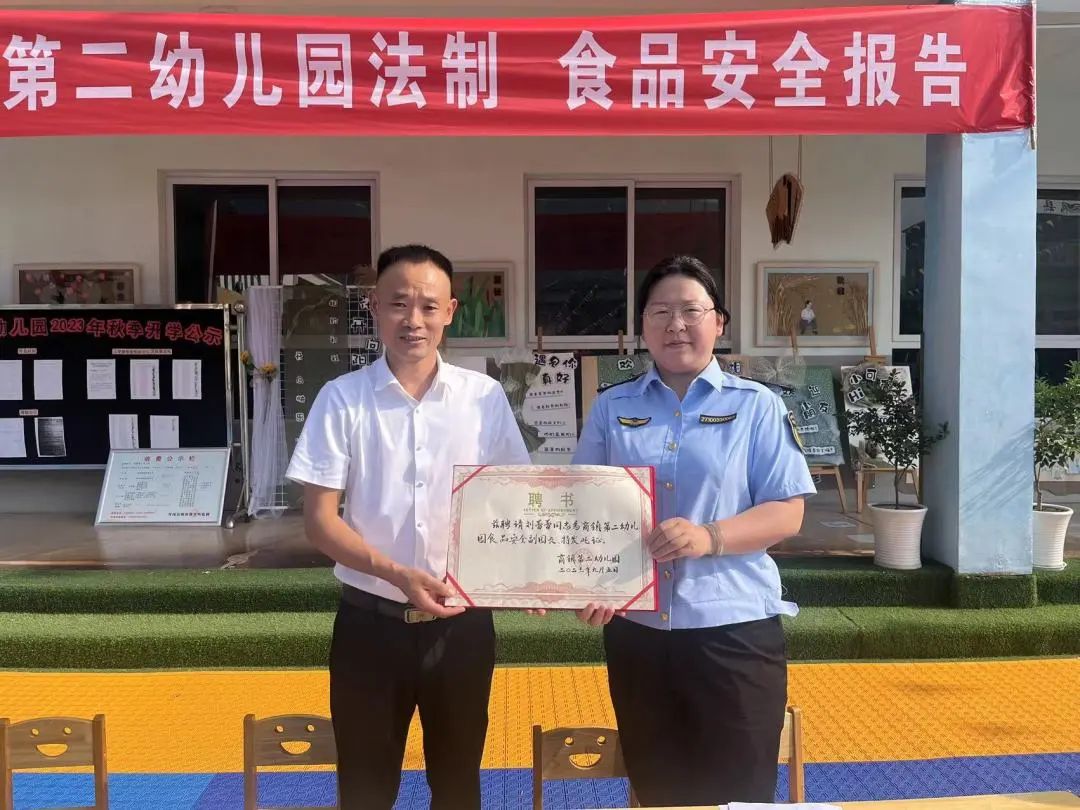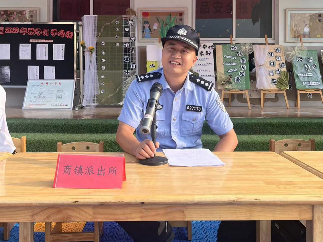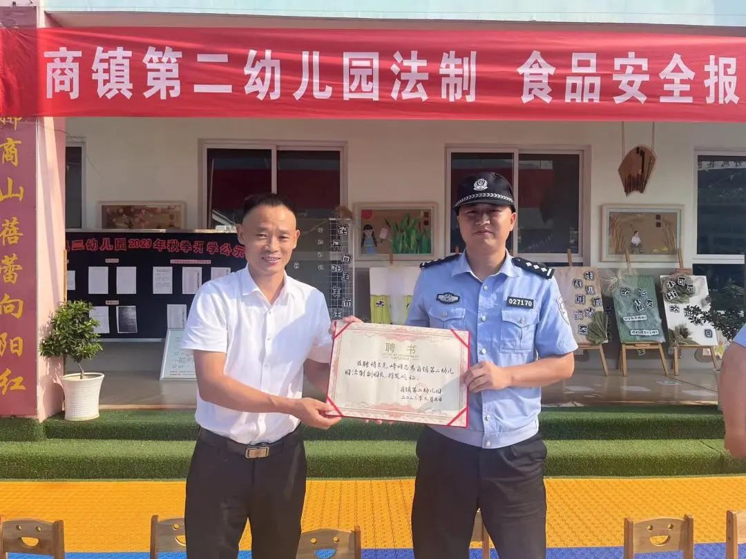 商镇第二幼儿园安保主任江波主持了此次活动,商镇第二幼儿园园长杜贵民为王先锋警官和刘蕾蕾同志颁发了聘书。