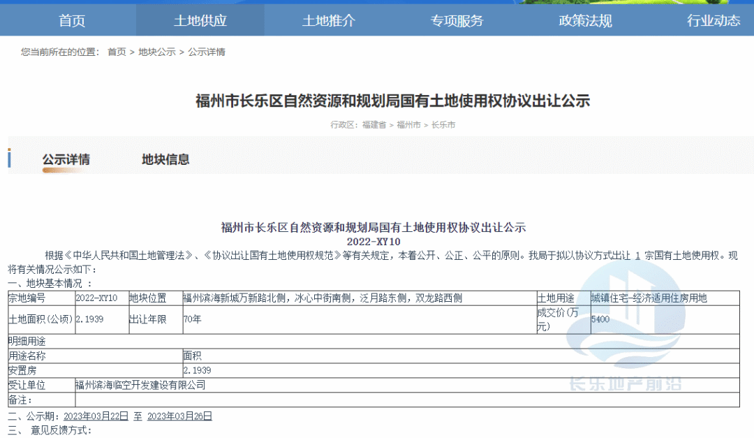 3月22日,长乐区自然资源和规划局发布一则国有土地使用权协议出让公示。内容显示,福州滨海临空开发建设有限公司通过协议出让方式,获得位于福州滨海新城万新路北侧,冰心中街南侧,泛月路东侧,双龙路西侧一幅住宅-经济适用住房用地(即滨海新城安置房十期)。