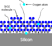 氧化在纯氧气氛下进行。硅和氧化物反应形成二氧化硅:该过程实际上是在 1000 至 1200 °C 的温度下完成的。氧气被引入到炉管中,并且与硅片接触,在高温下,氧气会分解,并与硅片表面的硅原子反应生成氧化硅。在干氧化过程中,由于硅二氧化层是由纯氧气氧化形成的,因此,其电介质性质相对于湿氧化过程中生成的氧化层会更优,这对于制造高性能的MOSFET器件非常关键。