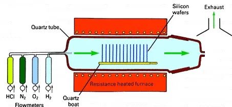 热氧化硅,即在高温中生长的氧化硅。硅片在约 1000 °C 的熔炉中进行氧化,硅上生成的氧化层称为热氧化硅(thermal oxide)。熔炉由石英管组成,其中晶圆放置在由石英玻璃制成的载体上。为了加热,有多个加热区,为了化学供给,有多个管道。石英玻璃具有很高的熔点(1500℃以上),因此适用于高温工艺。为了避免裂纹或变形,石英管缓慢加热(例如每分钟+10°C)。通过单独的加热区域可以非常精确地对管子进行加热。