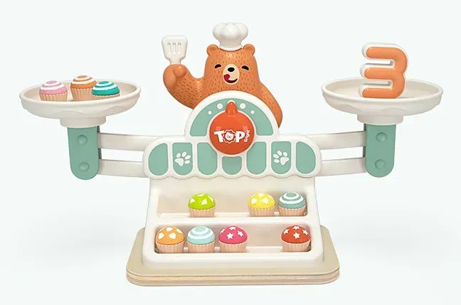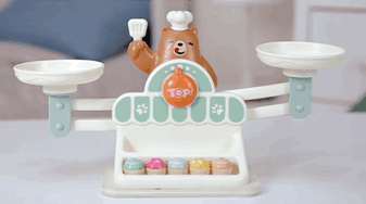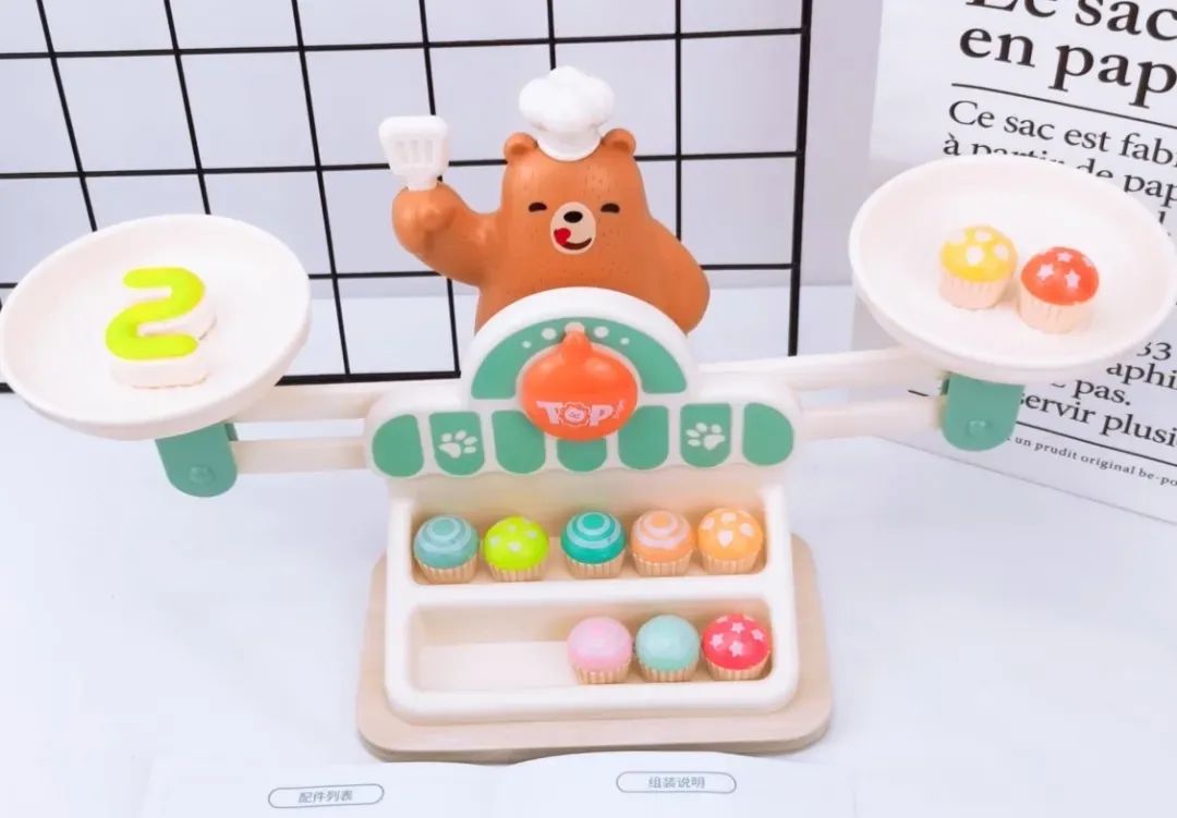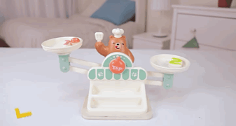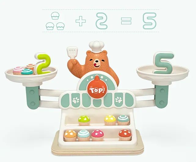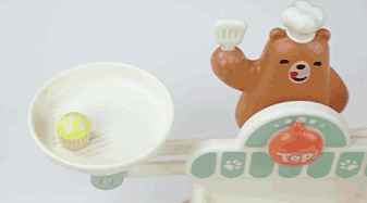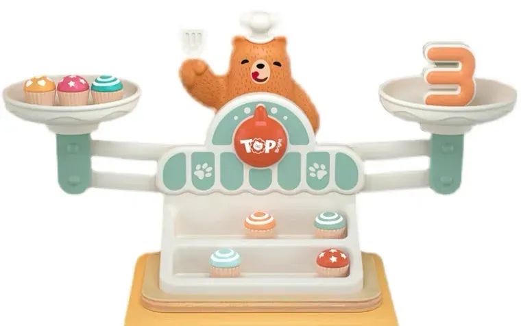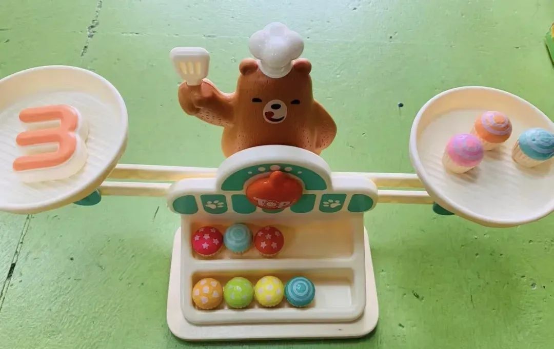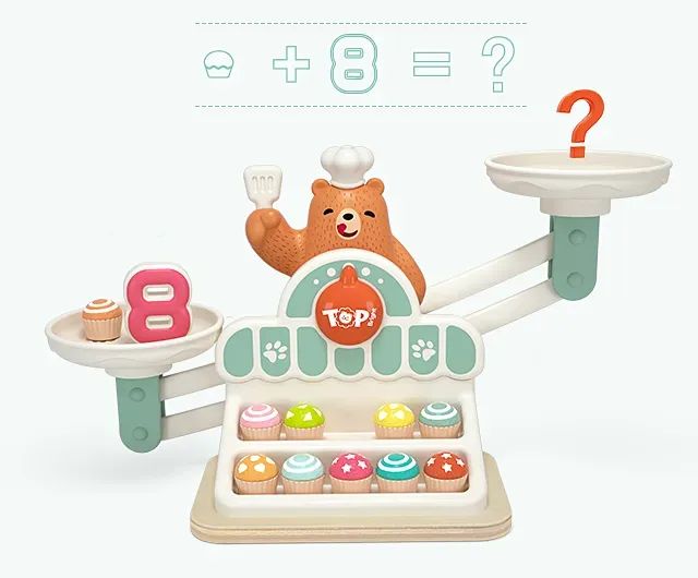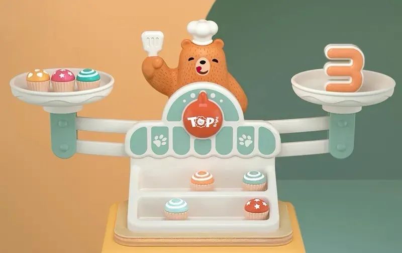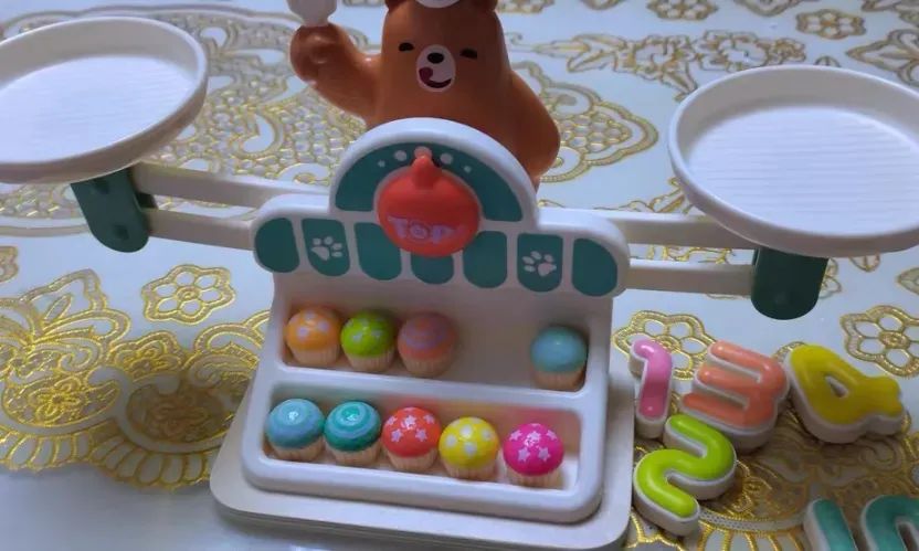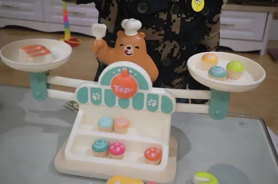比如天平左边放上数字3,右边让孩子数一数该放几只蛋糕,能让天平平衡,孩子就会明白3个的数量概念.即便多1只,天平也会直观展示出来。