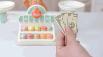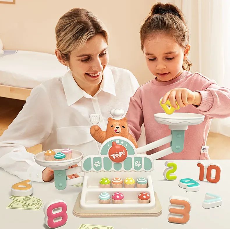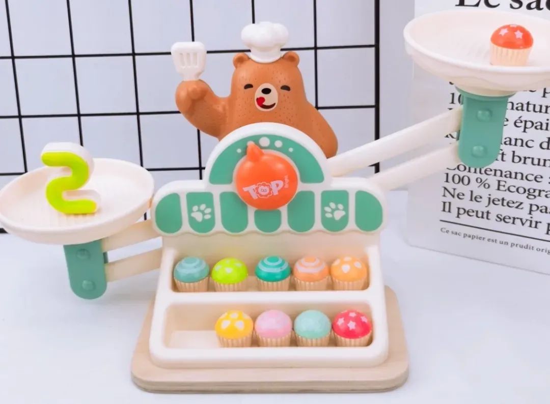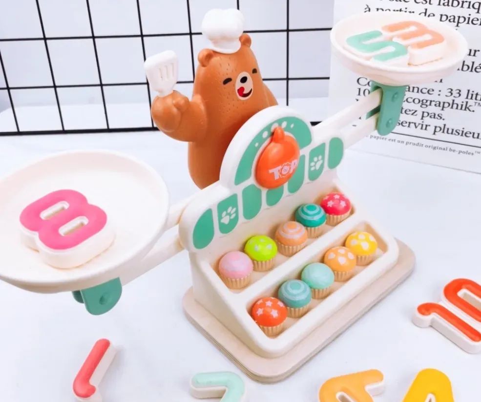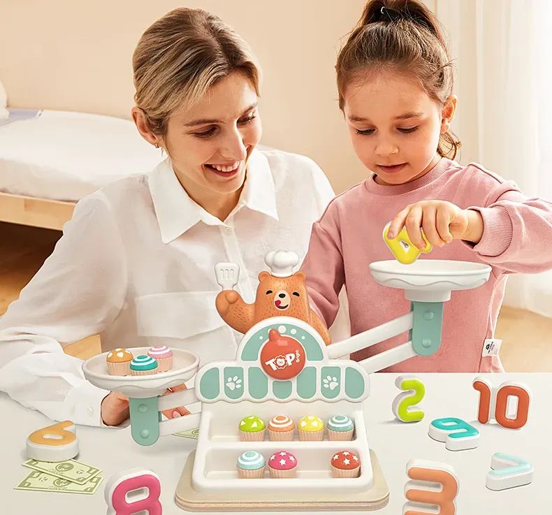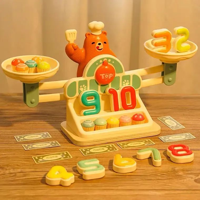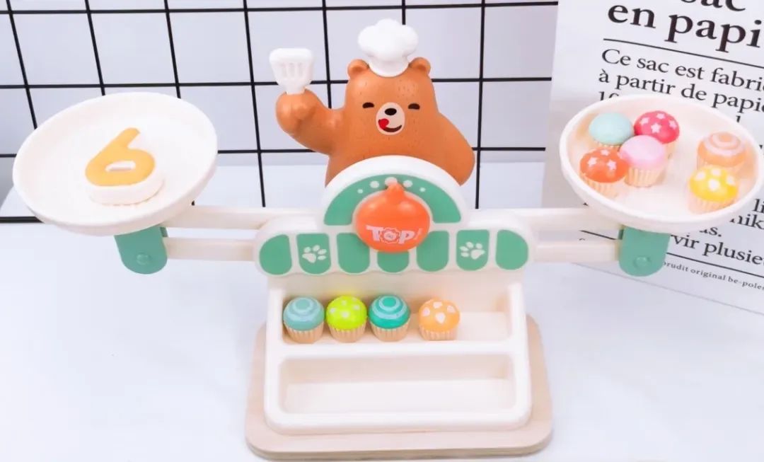 比如天平左边放上数字3,右边让孩子数一数该放几只蛋糕,能让天平平衡,孩子就会明白3个的数量概念.即便多1只,天平也会直观展示出来。