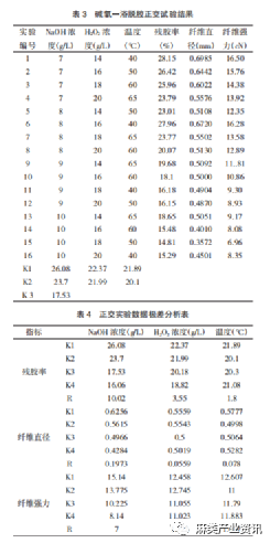 正交实验中选用的因素有:NaOH浓度、H2O2浓度、酶反应温度,每一个因素选取4个水平。3因素4水平正交分析表见表2,碱氧一浴脱胶正交试验结果见表3,正交实验数据极差分析见表4。