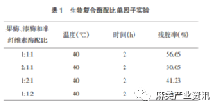 通过单因子实验确定复合酶配比。在浴比1:20、时间2h、温度40℃时的实验条件下复合酶配比单因子实验的结果见表1。