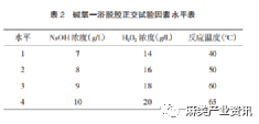 本实验中碱氧一浴脱胶,浴比采用1:20,反应时间为40min,在前期的实验中发现NaOH浓度、H2O2浓度、脱胶反应温度对脱胶的影响较大。本文实验中,利用正交分析法,达到优化脱胶处理工艺的目的,最终找到最佳的脱胶工艺参数。在正交分析法中,选用的因素有:NaOH浓度、H2O2浓度、脱胶反应温度,每一个因素选取4个水平,完成正交试验,以残胶率、纤维直径、纤维强力为考察指标,综合评判脱胶效果。