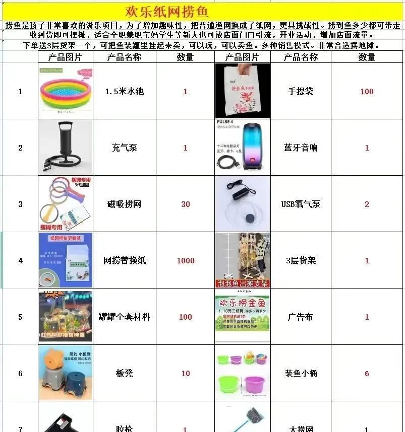 捞鱼是孩子非常喜欢的游乐项目,为了增加趣味性,把普通渔网换成了纸网,更具挑战性。捞到鱼多少都可带走。收到货即可摆摊,适合全职兼职宝妈学生等新人也可放店面门口引流,开业活动,增加店面流量。下单送3层货架一个,可把鱼装罐里挂起来卖,可以玩,可以卖鱼。多种销售模式。非常合适摆地摊。
