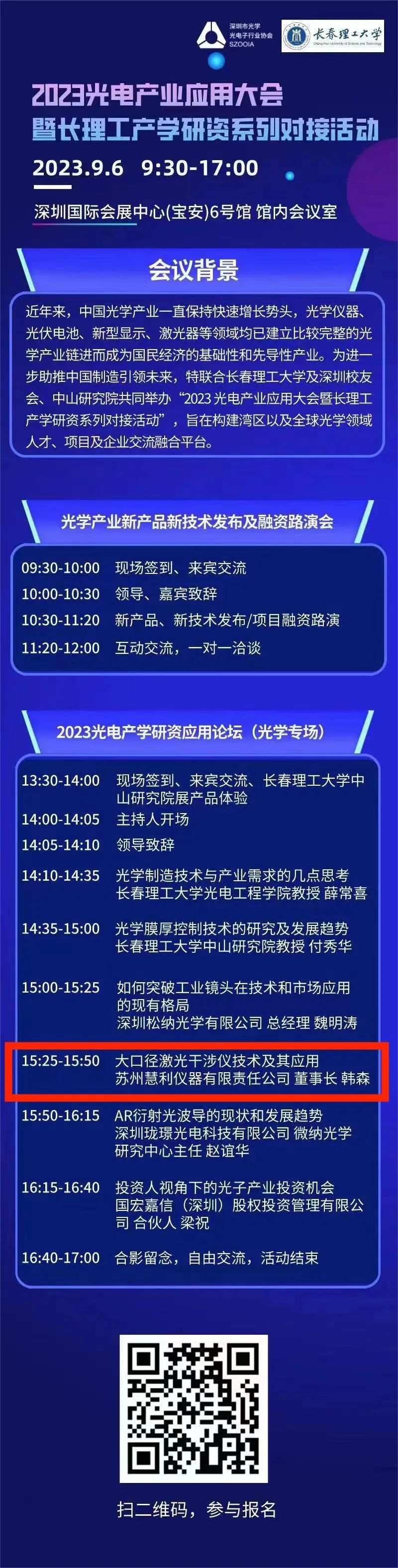 9月6日光博会期间,慧利仪器董事长韩森教授将于现场做“大口径激光干涉仪技术及其应用”报告,日程如下,敬请期待。
