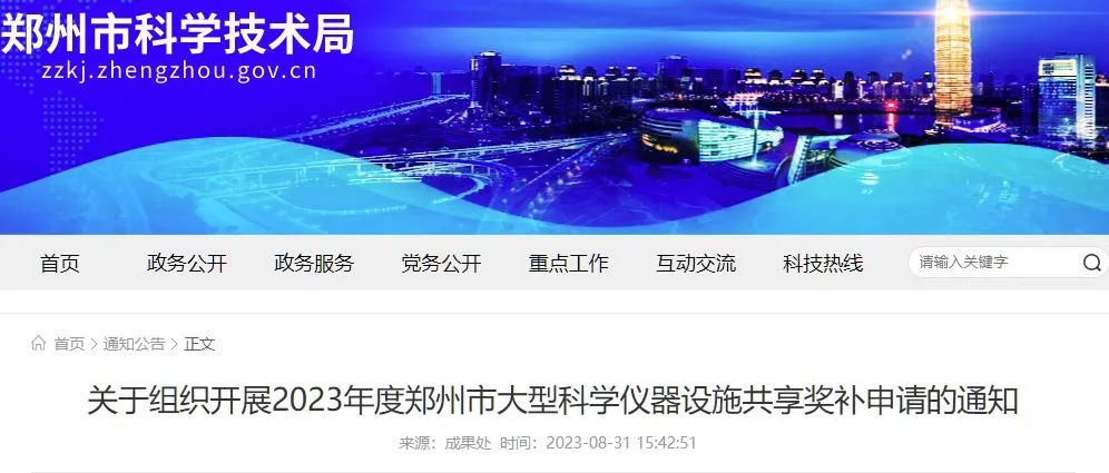 为促进大型科学仪器设施共享工作,依据《郑州市大型科学仪器设施共享实施细则》(郑科规〔2020〕5号),决定开展2023年度郑州市大型科学仪器设施共享奖补申请工作,现将有关事宜通知如下: