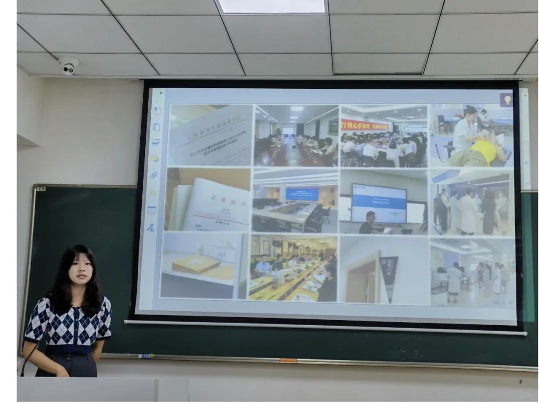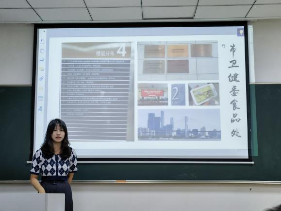 邢思佳首先分享了自己在上海市卫健委食品安全标准与检测评估处的暑期实习经历。她在一个多月的时间里,不仅有机会阅读、撰写相关文书,还协助参与了“肌少症筛查”“国家级营养健康社区”等多项营养特色工作。同时,她也随实习单位赴疾控中心、区卫健委、医疗单位开展实地调研和考察。其次,她也向同学们介绍自己前往安徽阜阳的营养支教过程。从前期备课,到实地教学,邢思佳为孩子们准备了关于丰富食物与合理膳食的特色课程,告诉孩子们不同食物的功能以及如何更好地搭配一日三餐。