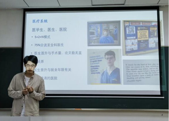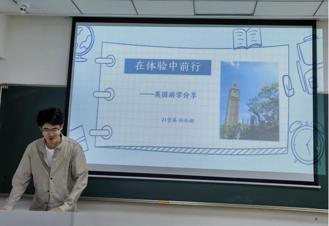 孙乐澍以在“体验中前行”为题,分享了在英国牛津大学暑期游学的经历。首先他为同学们介绍了暑期游学项目的主要内容,包括学习、工作、旅游、娱乐四个板块。然后他介绍了牛津大学,并将其与国内大学进行对比,引发了同学们对国内外大学教育体系的思考。随后他根据所见所闻,总结了英国相较于中国喜闻乐见的几点特色。他还介绍了英国医疗体系,从英国的NHS制度,医学生、医生、医院多个角度出发,探讨英国医疗特点。他还分享了自己对于教师和教育的看法,鼓励同学们多与老师交流,形成亦师亦友的良好氛围。最后,他希望同学们能够“享受青春,怀揣梦想,砥砺前行”,在新学期收获更多成长。