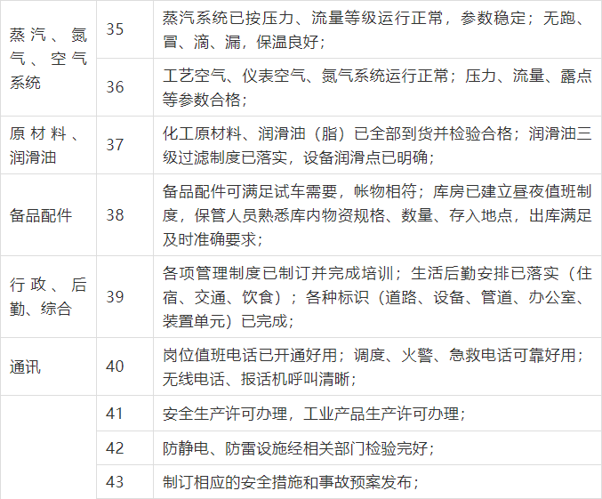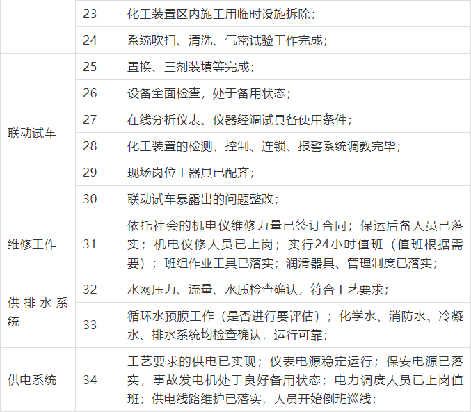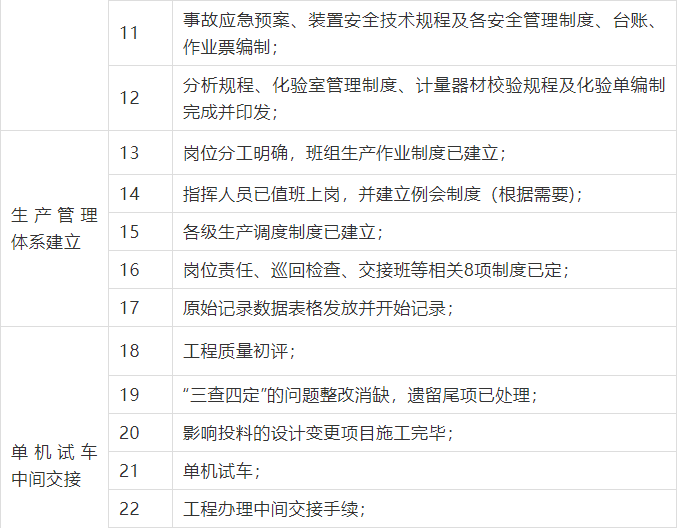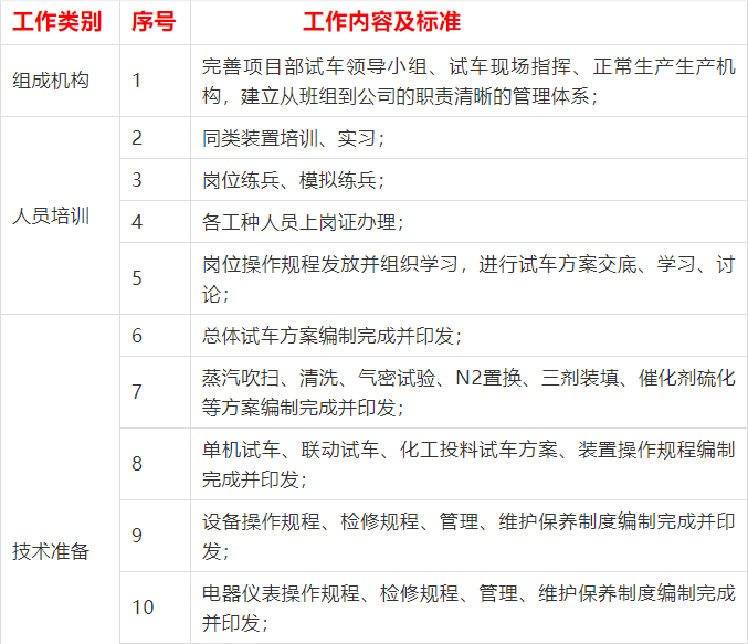 生产准备的主要内容是搞好人员组织、技术、全员培训、安全、物资及外部条件、管理等六个方面的准备。生产准备工作贯穿于基本建设的全过程,是工厂建设的一项极为重要的基础工作,心须从基本建设一开始就把这项工作提到重要议事日程上来,早抓、早落实,为确保化工试车一次成功创造条件,投产后长周期正常生产打下坚实的基础。