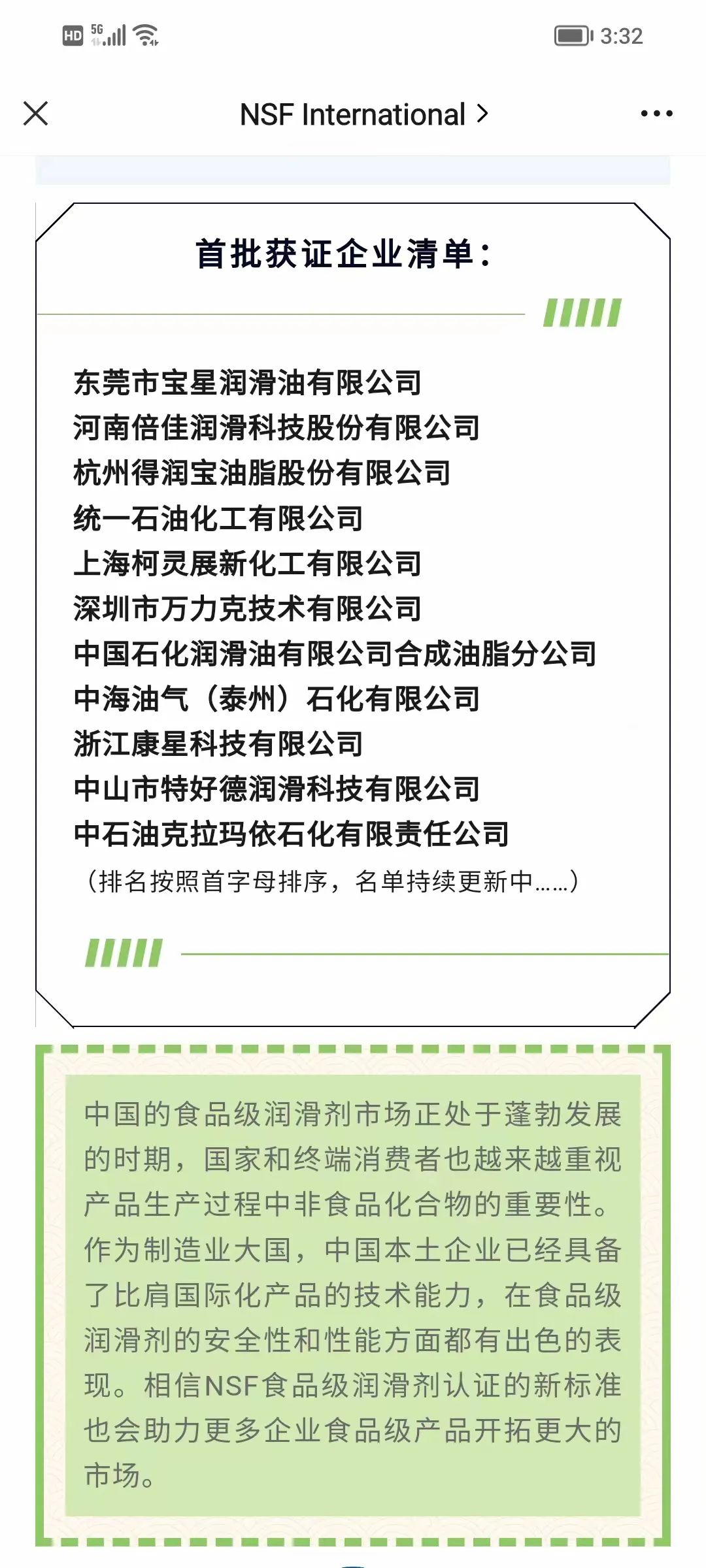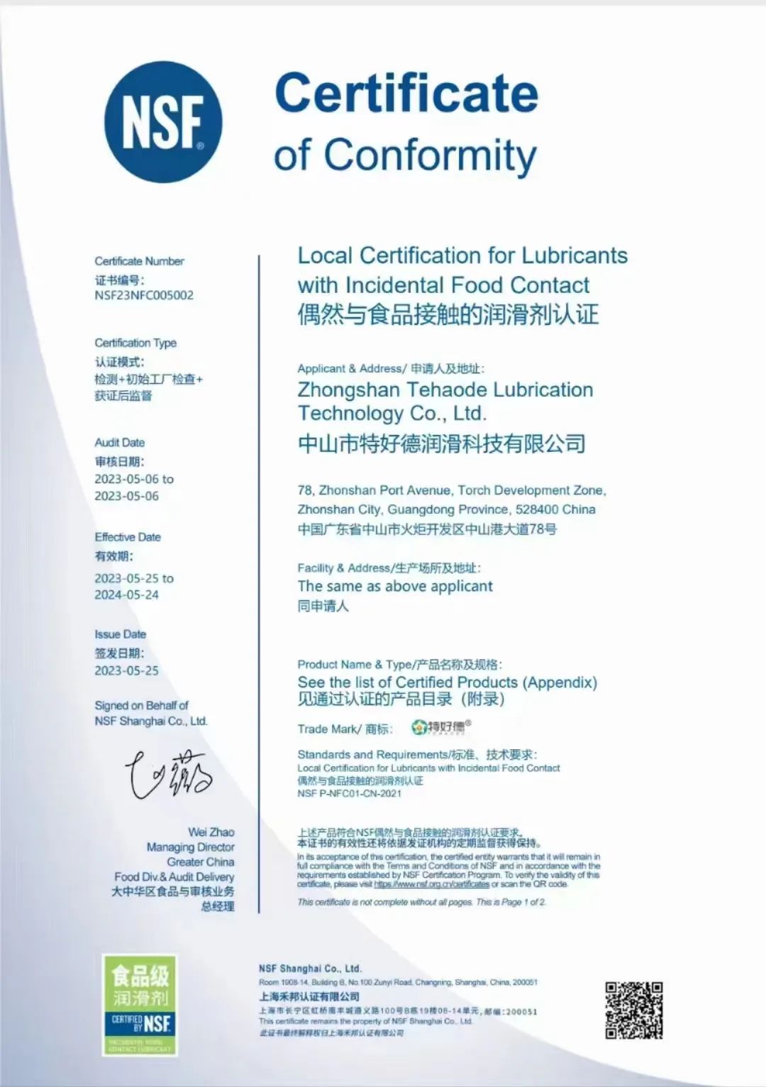 近日,有客户文总问我:NSF是什么?我这才发现很多人对于NSF并不了解,今天这篇文章我做个简单介绍。NSF International是一家始终专注于提升食品、水和环境健康标准的独立非营利性组织。它成立于1944年,以确保食品、水和环境得到全面评估、验证、检验和认证。在食品相关的领域,NSF致力于通过对生产、加工和分销食品材料的监督,为食品相关行业提供全方位的健康保障。在食品生产过程中,润滑剂具有不可或缺的作用。但是,由于部分润滑剂的成分可能会对食品造成较大的污染和危害,因此需要一系列的测试和监管。在这个背景下,NSF International开始推出食品级润滑剂认证。美国NSF食品级润滑剂认证要求产品通过严格的测试和质量控制,确保其在食品生产过程中不会对食品产生任何污染和危害。润滑剂材料的成分必须与FDA批准的使用条件相符,且必须遵循FDA CFR 21或其他类似标准。此外,还必须经过各种试验,包括化学分析测试、流动性测试、机械耐久性测试等等。只有通过所有测试的产品,才能获得NSF食品级润滑剂认证。这种认证的推出,也是因为润滑剂分为各种类型,其中某些润滑剂含有有毒有害的化学成分,可能会对人类健康造成威胁。NSF食品级润滑剂认证的出现,能够有效地保证润滑剂的质量和安全性,提高食品制造企业的信任,同时提高产品的竞争力。随着国内市场的不断发展,越来越多的食品级润滑油生产厂家开始注重产品质量,有意愿向NSF认证标准上看齐,不仅提高了自身生产工艺、技术和材料的质量,也为消费者的健康保障带来了积极的作用。我们特好德在今年年初就积极申请NSF认证,经过一系列努力,最终完成了NSF H1级别的认证,成为国内第一批通过认证的企业,又做了一回行业领头羊。