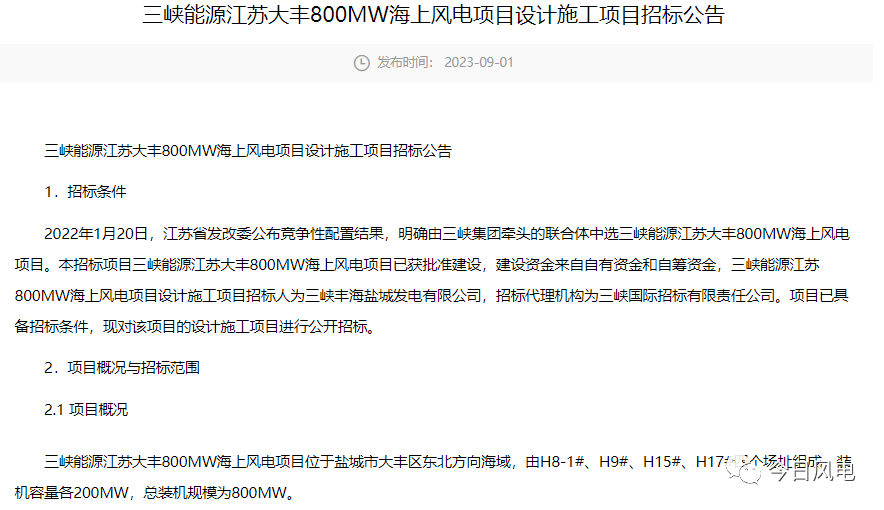 9月1日,三峡能源发布江苏大丰800MW海上风电项目设计施工项目招标公告。