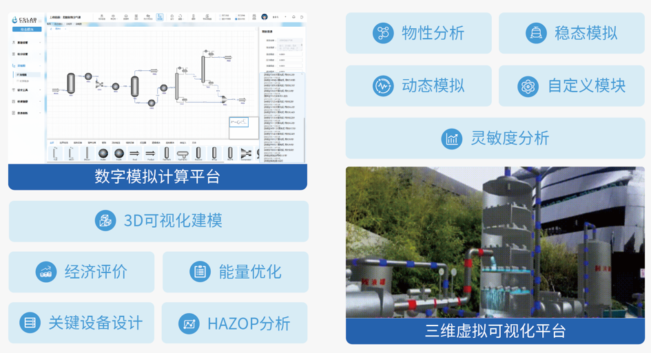 CS-LAB由双核心技术倾力打造:数字模拟计算平台,提供3D可视化建模、经济评价、能量优化、关键设备设计和HAZOP分析;三维虚拟可视化平台,则可以完成物性分析、稳态模拟、动态模拟、灵敏度分析以及自定义模块等功能。