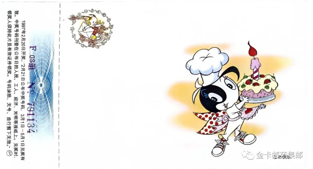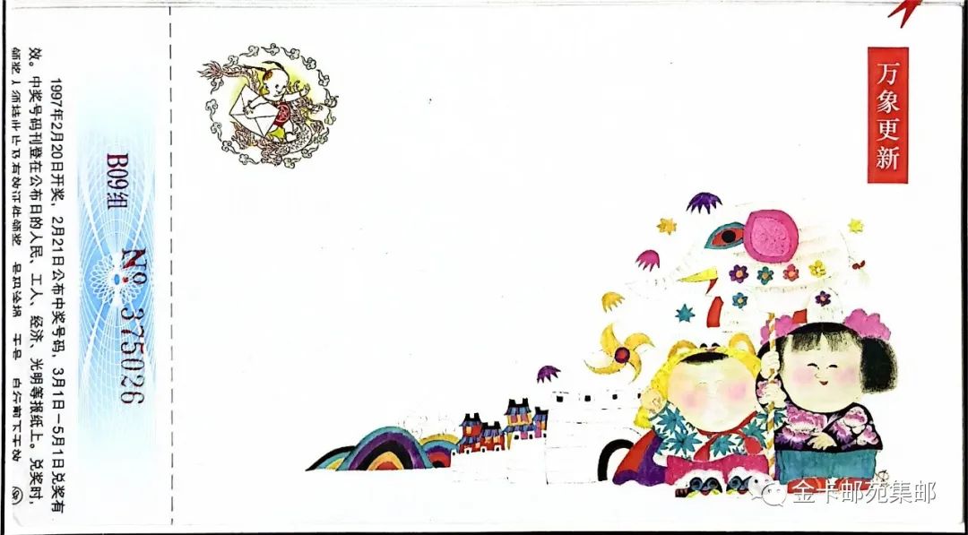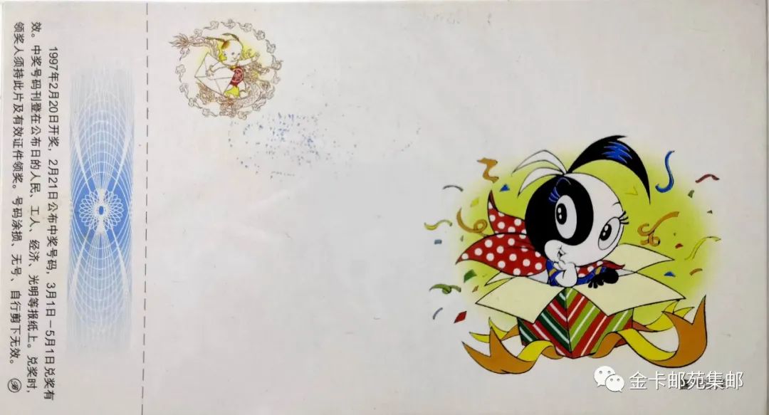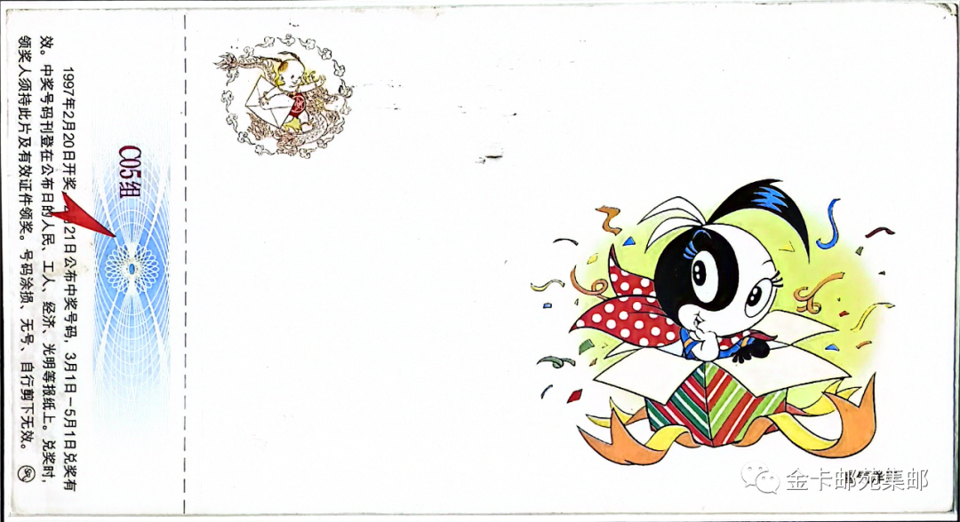 图1是中国人民解放军1206厂印刷的97贺年片组号及兑奖号漏印变体明信片,该明信片的组号和兑奖号同步漏印,说明该印刷厂承印的97贺年片的组号和兑奖号是最后同步印刷。