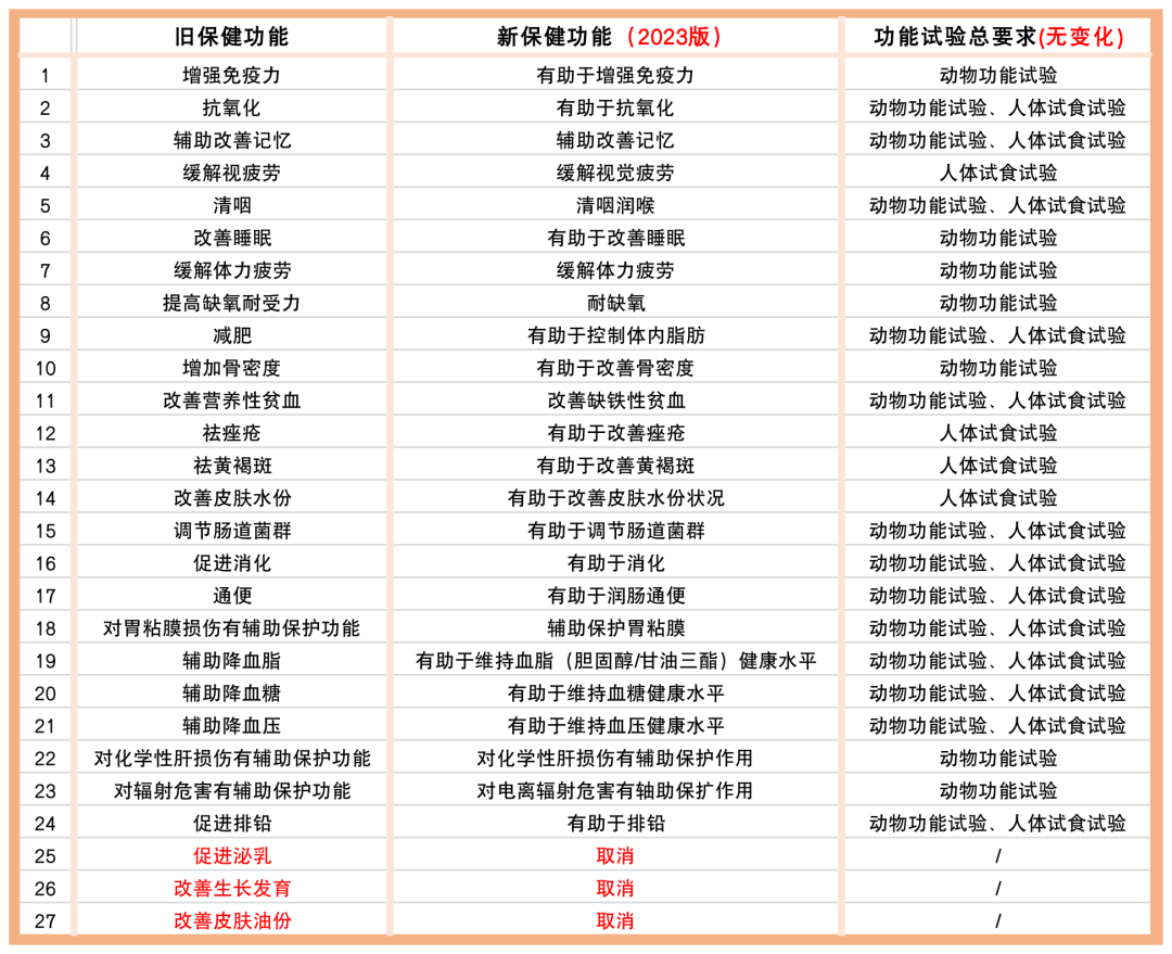 例如:“有助于增强免疫力”仍然只需要开展动物试验,“有助于抗氧化”仍需要开动物实验+人体试食试验。但新方法在一些细节均进行了一定更新,例如某些检测项目增多,评价指标变化等。
