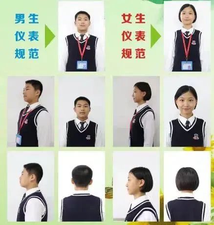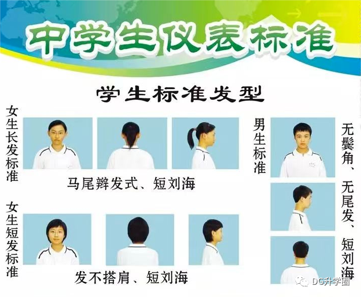 发式要求:不染不烫,不留怪发。男生:前不遮眉,后不搭领,侧不掩耳,不留鬓角,不剃光头。女生:前不遮眉,侧不遮耳,发不披肩(若是特殊情况要留长发必须扎起,且要向学校德育处申请)。