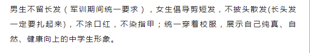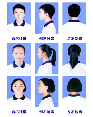 男生要求平头短发,女生齐耳短发,男女生不染发、烫发和涂抹定型水,不留奇异发型。