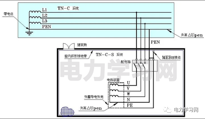 图中建筑物沿墙有一圈被称为MEB的接地体,MEB与建筑物的钢筋相连实现接地。在电源入户前,PEN线首先与MEB相接(注意入户前PEN与MEB之间的横线),然后分开为PE线和N线。
